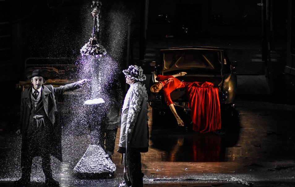 چون سینمای کلاسیک بر اساس ژانرها تعریف میشد پس بازگردیم و از اثر یک خوانش ژانر داشته باشیم و خصوصیات ژنریک را دنبال کنیم. در مرکز داستان به جای میسیسیپی، آناستازیا قرار دارد. آناستازیا همان زن اغواگر (فمفتال) مشهور نوآر است که سعی دارد از شر شوهرش خلاص شود. در این وسط مانند غرامت مضاعف و برخی دیگر فیلمهای مهم ژانر، زن اغلب از همسرش کوچک تر است. این وسط یک پلیس یا یک سیاستمدار خائن و آلوده نیز وجود دارد که این فرد همان دیگوست. مهمتر از همه جوانی که با زن اغواگر رابطه موازی را شکل داده است و از آناستازیا میخواهد به جای زندگی با این فرد -که هیچ سنخیتی با او ندارد- به ندای دلش گوش دهد. این جوان کمی نیز پاک است. به طور مثال از کشتن میسیسیپی سرباز میزند، اما سیاستمدار فاسد یعنی دیگو به دلیل آن عشق به آناستازیا و ظاهر فریبنده او حاضر به هر کاری هست. شاکله قصه دورنمات که در همان سالهای طلایی سینمای نوآر نوشته شده با همان صحنه پردازیها، سایهها، برف جای باران، سردی رنگ ها و فضا بر روی صحنه حاضر شده است. حتی نمایش در پایان دارای یک تیتراژ پایانی فیلم است که تصاویر سینمای نوآر را به یاد میآورد.